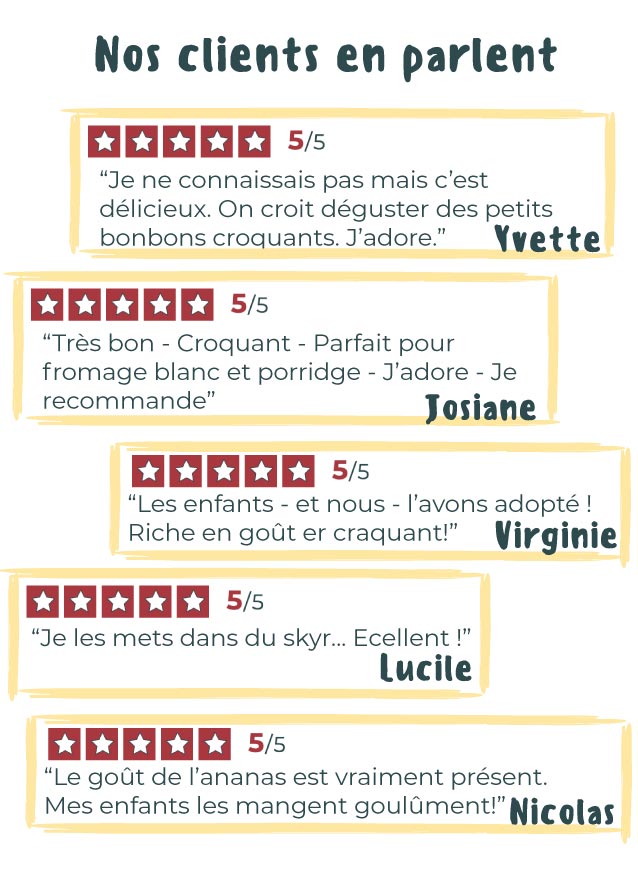 Nota bene : les fruits lyophilisés d'origine française sont quasi impossibles à trouver. Nous importons plus de la moitié des fruits frais consommés en France. Les fruits locaux sont tous consommés frais (sauf quelques exceptions comme les pommes qui sont transformées ou exportées). C'est pourquoi vous ne trouvez pas de fruits d'origine France dans nos produits. Peut-être un jour ?
