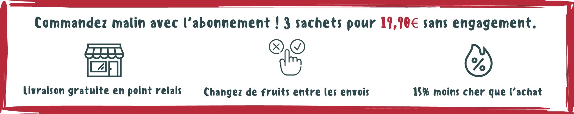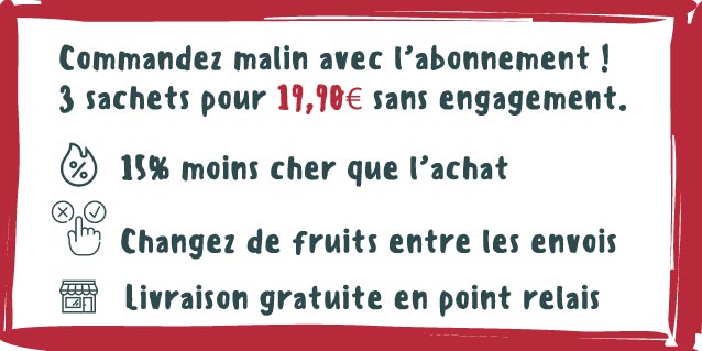 | ✔ Les commandes sont assemblées sous 24h et expédiées sous 48h. En effet, nous préparons les commandes de fruits en ESAT, et nos délais sont en accord avec leurs possibilités. |